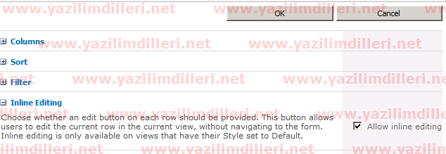 Inline Editing sekmesinden Allow inline editing seçeneğini seçerek kayıt ekleme/düzenleme işlemlerinin kaydın olduğu satırda yapılmasını (grid mantığı) sağlayabiliriz.