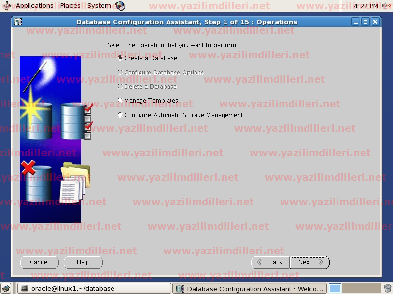 16)   Database Configuration Assistant penceresinde, Create a Database seçeneğini tıklayarak ileriliyoruz.