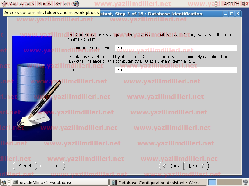 18)   Üçüncü adımda Global Database Name kısmına veritabanı ismini yazıyoruz. Ben örneğimde ORCL ismini giriyorum. SID otomatik olarak tekrar ORCL olmakta. (NOT: Oracle kullanıcısının profilinde tanıttığımız ORACLE_SID değişken ismi ile burda girilen SID isminin aynı olması lazım)