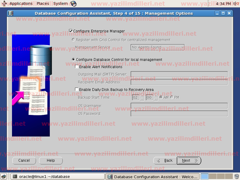19)   Oracle veritabanını ve ASM instance yönetmek için Oracle ile gelen Enterprise Manager konsolunun yüklemek için Configure Enterprise Manager seçeneğini seçip diğer ayarları varsayılan ayarlarda bırakıyoruz ve ilerliyoruz.