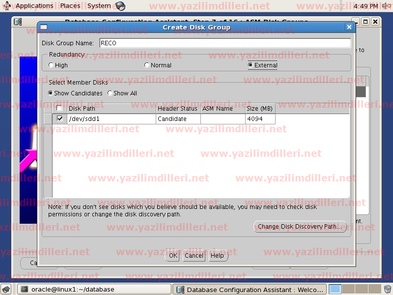 23)   Disk Group Name kısmına RECO yazıp listedeki tek diski işaretleyerek, REDUNDANCY seçeneğini tek diskimiz olduğundan External olarak işaretleyip OK düğmesine tıklıyoruz.