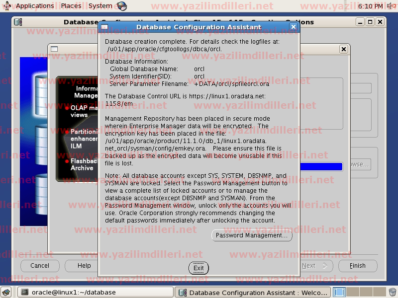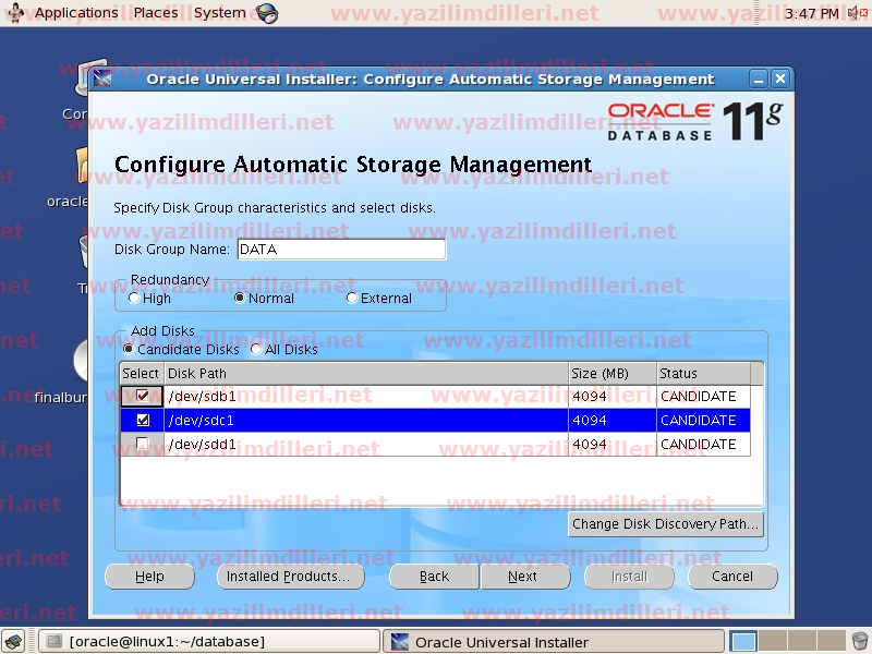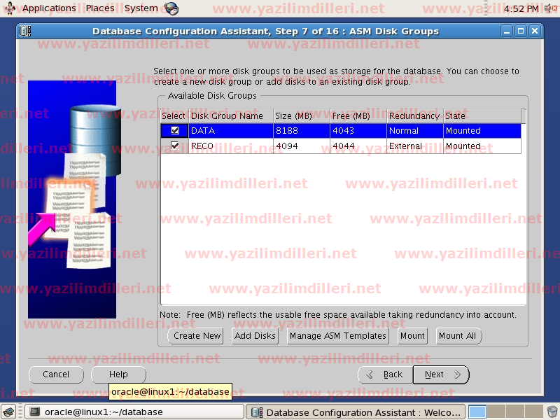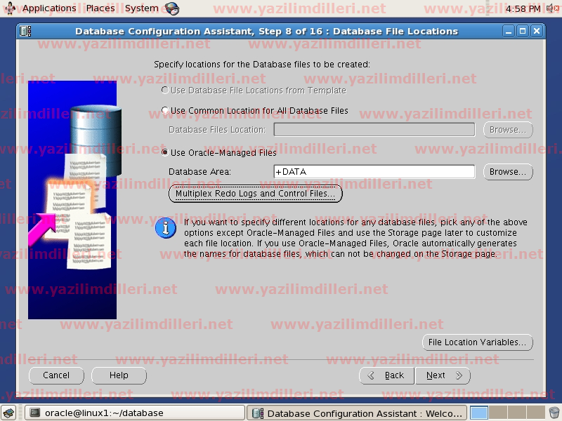 25)   Oracle dosyalarının lokasyonu +DATA şeklinde bir lokasyonda yer almaktadır. Oracle, ASM ile bundan sonra tüm database dosyalarını DATA adlı diskgrubu içindeki mevcut disklerde paylaştıracak ve yönetimini otomatik olarak kendisi yapacaktır. Multiplex Redo Logs and Control Files seçeneğini tıklayarak alternatif lokasyon belirleyebilir ve disk grubunda bir sorun meydana gelse dahi veritabanın çalışmasını sağlayan redo loglar ve kontrol dosyalarının farkli yerlerde de barındırılması sebebiyle veritabanını kolayca ayağa kaldırabilirsiniz.