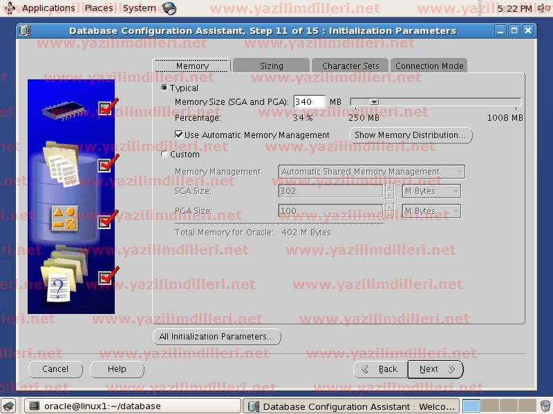 MEMORY: instance yönetimi için kullanılan bellek yönetimi ve değerlerinin yer aldığı pencere gelmektedir. Oracle11g ile yeni gelen bir özellik olan Automatic Memory Management(Otomatik Bellek Yönetimi) özelliği seçili olduğu takdirde instance bellek yönetimi Oracle tarafından yapılacaktır. Yüksek performans için bu seçeneğin işaretlenmesi tavsiye edilir.