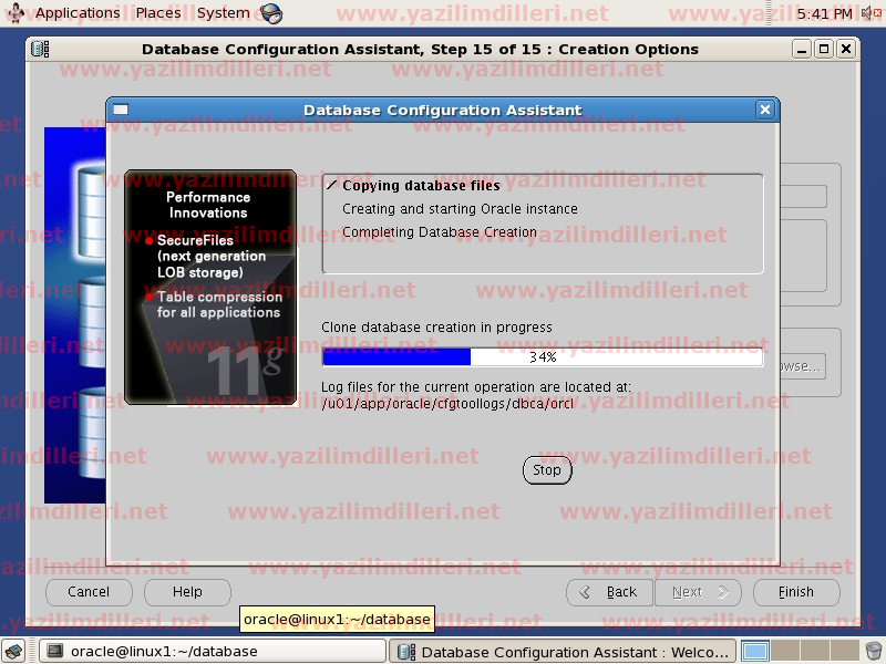 32)   En son pencerede Create database seçeneği işaretlerek FINISH düğmesine basarak veritabanını oluşturabilir, yada Save as a database template seçeneğini seçerek mevcut konfigürasyonu şablon olarak kaydedebilir ve ilerde veritabanı oluşturmak için kullanabilirsiniz.
