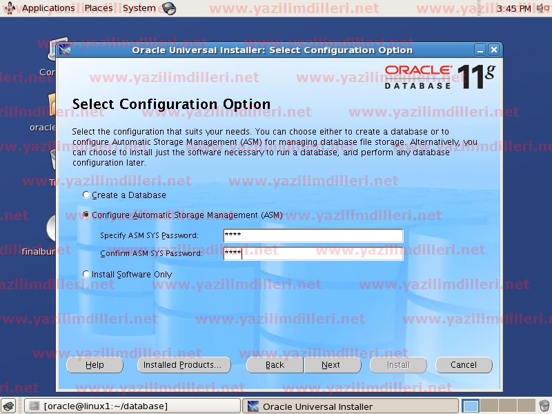 21)   Bir sonraki adımda yeralan Storage Options kısmında veritabanımızın depolama seçimini yapmamız gerekecek. Daha önceden ASM kurduğumuzdan ASM seçeneğini seçip ileriliyoruz.