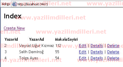 YazarId’si 1 olan kayıt veritabanından silindi ve yeniden Index sayfası açıldı.