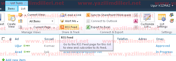 Bu işlem aslında Sharepoint’in kendi içerisinde mevcut olan RSS Feed özelliği ile gerçekleşmektedir. List Tools -> Share & Track -> RSS Feed seçeneğini seçerek listenin RSS beslemelesine erişebiliriz.