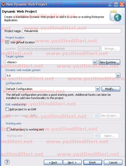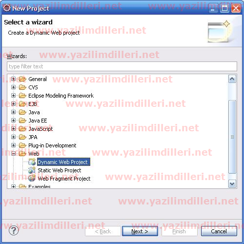 Proje seçim ekranından Web->Dynamic Web Project’i seçiyoruz.