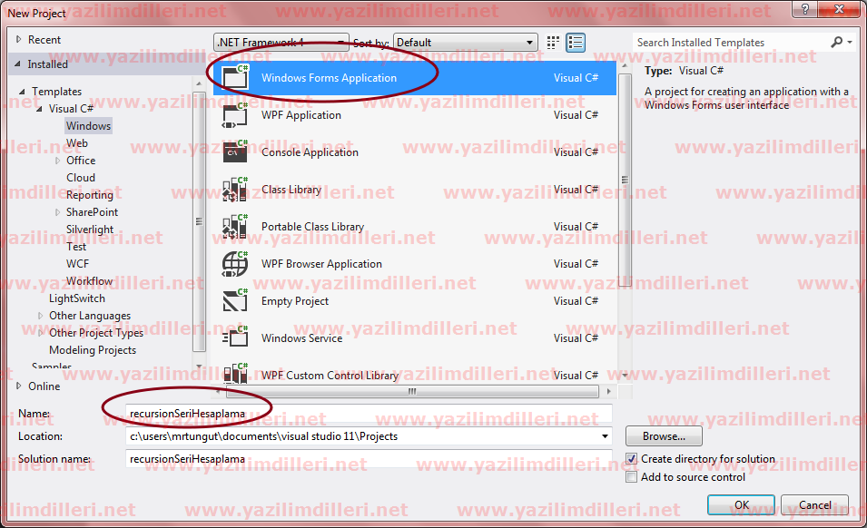 Windows Form uygulaması yaratmak üzere ismini de recursionSeriHesaplama yaparak OK diyelim.