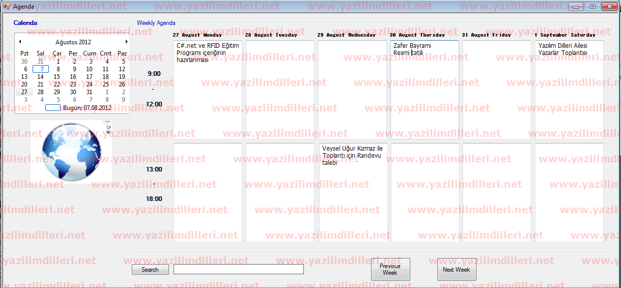 Form yüklenirken, mevcut olan gün hangi gün ise, mevcut günün Kırmızı renkte gösterilmesi gerekiyor. Bu makaleyi hazırladığım gün Mevcut tarih 7 ağustos tarihini göstermekteydi. Siz uygulamayı kendi bilgisayarınızda çalıştırdığınızda mevcut günü gösterecektir.
