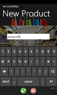 Yeni ürün oluşturma sayfası bir ürün isminin girilmesi için TextBox ve onay ve iptal için iki adet ApplicationBarIcon butonlarından oluşur.