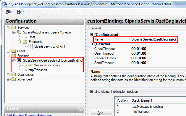 Artık özel bağlayıcı tip içerisinde kullanılacak olan tüm kanal ve özellikler belirlenmiştir. Son aşamada dikkat edilmesi gereken nokta söz konusu kanalların uygulanış sırasıdır. Bir başka deyişle kanal yığını(Channel Stack) içerisindeki sıranın önemi vardır. Yukarıda geliştirilen örneğe göre sıra aşağıdaki ekran görüntüsündeki gibi olmalıdır. Buna göre reliableSession ile başlayan sıra security, textMessageEncoding(Mesajlaşma Kanalı) ve tcpTransport(iletişim kanalı) şeklinde devam etmelidir. Bu sırayı ayarlamak için Up ve Down başlıklı düğmeler kullanılabilir.