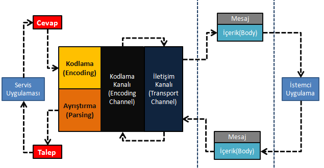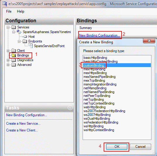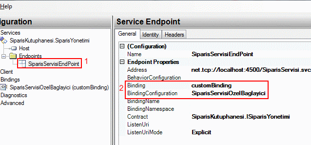 Bu işlem sırasında Binding değeri customBinding olarak seçildiğinde BindingConfiguration özelliğinin değeri otomatik olarak SiparisServisiOzelBaglayici olarak değişecektir. Servis tarafında yapılan bu ayarlardan sonra konfigurasyon dosyasının son hali aşağıdaki gibi olacaktır.