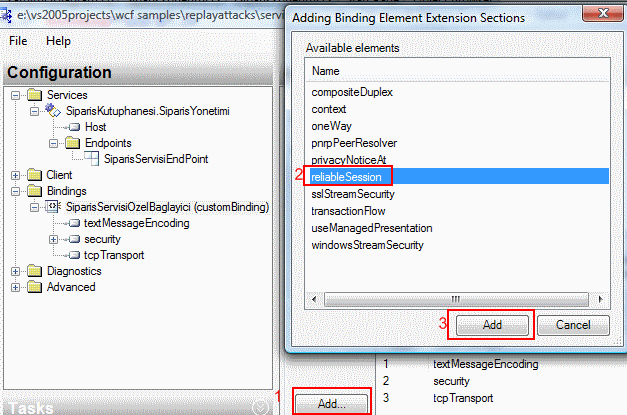 Bu kısımda oldukça fazla sayıda ayar ve kafa karıştırıcı özellik yer almaktadır. Ancak en çok dikkat çekenlerden birisi ReplayCacheSize değeridir. Buraya atanan değer, tamponda tutulacak olan nonce' ların sayısıdır. Söz konusu değerin dışına taşılması durumunda, tamponda duran en eski nonce değeri atılacak ve yerine son gelen nonce değeri yazılacaktır. Ancak varsayılan 900000 değeri pek çok vaka için yeterli bir sayıdır. Bellek optimizasyonu adına bu değerin azaltılmasıda düşünülebilir. Fakat az öncede belirtildiği gibi, sayının dışına çıkılması halindeki durumlar göz önüne alınmalıdır. Nitekim eski nonce' ların silindiği ve yeni gelenlerin yazıldığı sıralarda sistem cevaplama saldırılarına(Replay Attack) karşı kısa sürelide olsa savunmasız kalabilir. Bu işlemlerin ardından elbetteki bağlayıcı tipin güvenilir bir oturum(Reliable Session) açabilmesi için, yine Add düğmesi ile açılan pencereden ReliableSession elementi seçilmelidir.