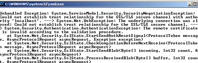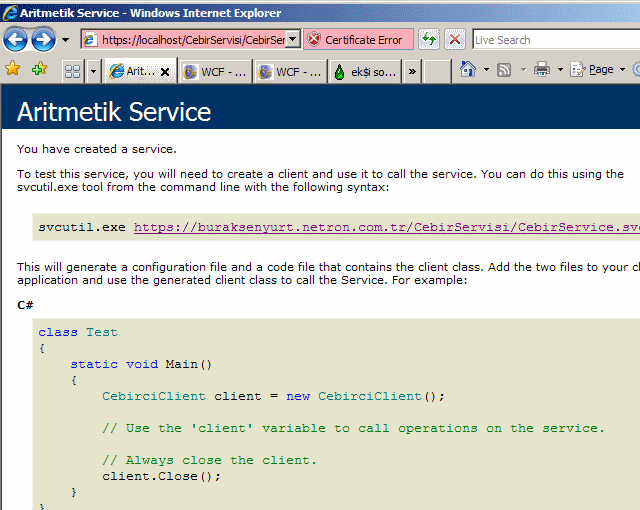Geliştirilen örnekte test amaçlı sertifika kullanılmasının oluşturduğu bazı negatif etkiler vardır. Bu nedenle yukarıdaki kod parçasını içeren istemci uygulama yürütüldüğünde çalışma zamanında(Runtime) SecurityNegotiationException tipinden bir istisna mesajı alınması kuvvetle muhtemeldir.