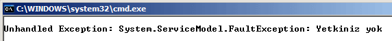 Bundan sonra tek yapılan, Roles sınıfının IsUserInRole metodunu kullanarak, güncel içerikteki kullanıcının Personel rolünde olup olmadığının tespit edilmesidir. Eğer kullanıcı Personel rolünde ise hesaplama yaptırılır. Aksi halde bir FaultException üretilip istemci tarafına doğru fırlatılır. İstemci tarafında bulents isimli kullanıcı ile Topla metoduna erişmek istediğimizde çalışma zamanında FaultException üretildiğini görürüz.