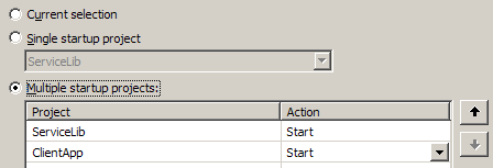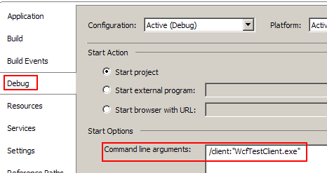 İlk olarak proxy sınıfına ait nesne örneği oluşturulmaktadır. Hemen ardından Start, IncreaseValue, GetInstanceId ve Stop servis metodları sırasıyla çağırılır. Hatırlanacağı üzere Start metodu ile Servis örneğinin tabloya atılması, Stop metodundan sonra ise tablodan servise ait ilgili satırın silinmesi gerekmektedir. Bu ilk vakayı analiz etmek için servis kütüphanesi ve istemci uygulamayı aynı anda çalıştırmalıyız. Bu nedenle iki ön hazırlık yapılmalıdır. Bildiğiniz gibi Visual Studio 2008 ile birlikte WCF Servis kütüphanelerini başlatılabilir ve built-in gelen servis, istemci uygulamalarını kullanarak testler yapılabilir. Bu örneğimizde istemci tarafını kendimiz geliştirdiğimiz için servis kütüphanesi özelliklerinden WcfTestClient.exe' nin çalıştırıldığı komut satırı parametresini kaldırmamız gerekmektedir.