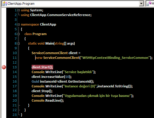 Böylece servis kütüphanesine ait test sunucusu önce çalışacak sonrasında ise istemci uygulamamız yürütülecektir ki bu hazırlık özellikle kodu debug etmemizi kolaylaştıracaktır. İlk test için istemci tarafındaki Start metodu çağrısına bir breakpoint koymamız gerekmektedir.