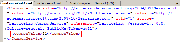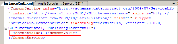 CommonService içerisinde tanımlanmış olan commonValue alanının ilk atanan değeri burada açık bir şekilde görülmektedir. Elbetteki serileşen tipin içerisinde kaç tane alan(field) varsa, bunların anlık olarak değerlerinin tamamı serileştirilen bu içeriğe atanmaktadır. Eğer kodda F10(Step Over) ile ilerlenmeye devam edilirse IncreaseValue metodu geçildikten sonra XML içeriğinin aşağıdaki hale geldiği görülür.