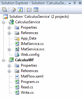 Burada durup aslında biraz soluklanmak belki bir yudum kahve içmek ve sonrasında XAML içeriğine yoğunlaşarak düşünmek gerekmektedir. Dikkat edileceği üzere WF' in tüm içeriği, Write, Read, ClientOperation aktiviteleri, global WF değişkenleri bu XAML içeriğinde bildirilmektedir. Tabiki bu XAML içeriği çalışma zamanı tarafında değerlendirilmektedir. Dekleratif(Declerative) bir yaklaşımdan ziyade ClientOperation aktivitesinin XAML içerisine nasıl gömüldüğüne dikkat etmemizde yarar vardır. Öyleki EndPoint ve buna ait AddressBindingContract bilgilerinin tamamı XAML elementleri içerisinde oluşturulmuştur. Buna göre XAML içeriği basit bir editor yardımıyla değiştirildiği takdirde Workflow örneğinin yeni ortam şartlarına göre adapte edilmesi kolayca sağlanabilir. Söz gelimi, servis adresinin değişmesi veya operasyon adında yada parametrik yapısında oluşabilecek değişiklikleri koda girmeden düzenleyebilir ve WF' in güncellenmesini sağlayabiliriz. Bunun sağlanmasının en büyük etkenlerinden birisi Workflow bazlı WCF servislerinin kod yazmadan XAML tabanlı geliştirilip kullanılabiliyor olmasıdır. (Bu alt yapıyı ve Workflow bazlı bir WCF servisinin XAML ile dekleratif olarak nasıl tanımlanabileceğini ilerleyen makalelerimizde veya görsel derslerimizde incelemeye çalışacağız.) Artık örneğimizi test etmeye başlayabiliriz. Bundan önce Solution' ımızın son halinin aşağıdaki ekran görüntüsüne benzer olacağını düşünebiliriz.