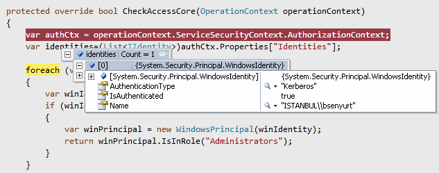 WcfTestClient uygulamamızı Run As.. komutu yardımıyla önce bsenyurt kullanıcısı ile çalıştıralım. Eğer Asp.Net Developement Server' ı Visual Studio ortamına Attach' larsak CheckAccessCore metodu içeriğini de debug edebiliriz. Buna göre debug modunda aşağıdaki sonuçlar ile karşılaşırız.