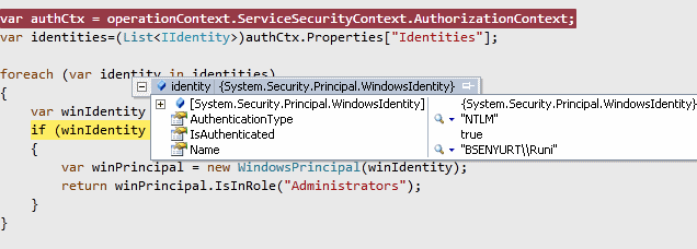Şimdi de WcfTestClient aracını Runi isimli kullanıcı ile çalıştıralım. Debug modda aşağıdaki sonuçlar ile karşılaşırız.
