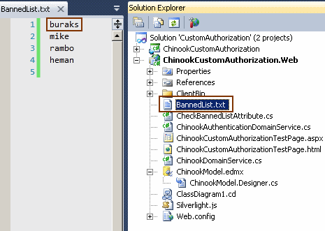 Senaryomuza göre Domain Service içerisinde tanımlanmış olan herhangibir operasyonun gerçekleştirilmesi sırasında, talepte bulunan kullanıcının içerisinde bulunduğu role değil, adının özel olarak tutulan yasaklı bir listede bulunup bulunmadığına bakılması durumu ele alınmaktadır. Bu yasaklı listenin ASP.NET Membership tarafından hazır olarak tutulan veritabanına extend edilmiş bir tablo içerisinde tutulması mümkündür. Bunun dışında dosya tabanlı olarak XML veya basit Text formatında dahi tutulabilir. Hatta olayı biraz abartıp Windows Registry ayarlarında dahi tutulması ve benzer saklama alanları düşünülebilir. Hatta bu listenin bir uzak sunucuda duruyor ve ancak servis bazlı bir operasyon yardımıyla kontrollerin yapılabiliyor olması da söz konusu olabillir. Tabiki dosya tabanlı olan saklama şekli bu seçenekler arasında en az güvenli olanıdır. Nitekim dosyanın güvenliğini sağlamak, veritabanı içerisindeki bir tabloya göre çok daha zor olabilir. Ancak amacımız yetkilendirme işlemi için özel nitelik yazılması ve kullanılması olduğundan bebek adımlarıyla ilerleyeceğiz. Bu nedenle geliştireceğimiz örnekte basit olarak yasaklı listenin bir Text dosyada düzenli olarak tutulduğunu varsayıyor olacağız. Buna göre System.Web.DomainServices.AuthorizationAttribute niteliğinden türettiğimiz tipin içerisinde yer alan Authorize metodu içerisinde gelen kullanıcı adının, yasaklı listede olup olmadığını kontrol etmemiz yeterli olacaktır. İşte sunucu tarafında yer alan CheckBannedListAttribute sınıfı içeriğimiz.