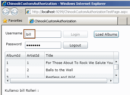 Görüldüğü gibi CheckBannedList niteliği, yasaklı liste yetki kontrolü yapılmak istenen operasyonun üzerinde uygulanmaktadır. Buna göre çalışma zamanında Login olan bir kullanıcının söz konusu GetAlbums operasyonunu talep etmesi halinde devreye girecektir. Söz gelimi text dosyamız içerisinde aşağıdaki isimlerin yer aldığını varsayalım.