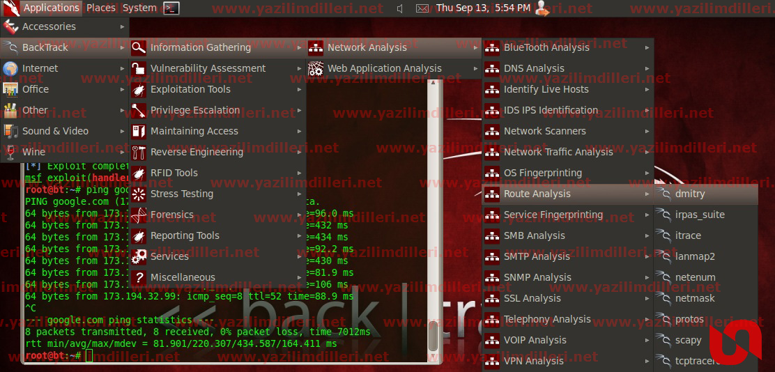 BackTrack > Information Gathering > Network Analysis > Route Analysis > dmitry izlenerek açılır.