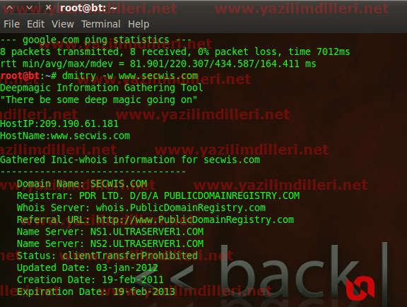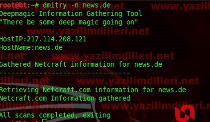 Dmitry, hedef hakkında bilgi toplayan bir backtrack aracıdır. C dilinde kodlanmıştır. Ayrıca subdomain, uptime bilgi, tcp bağlantı noktaları, email adresleri, whois vs gibi bilgileri toplamaktadır.