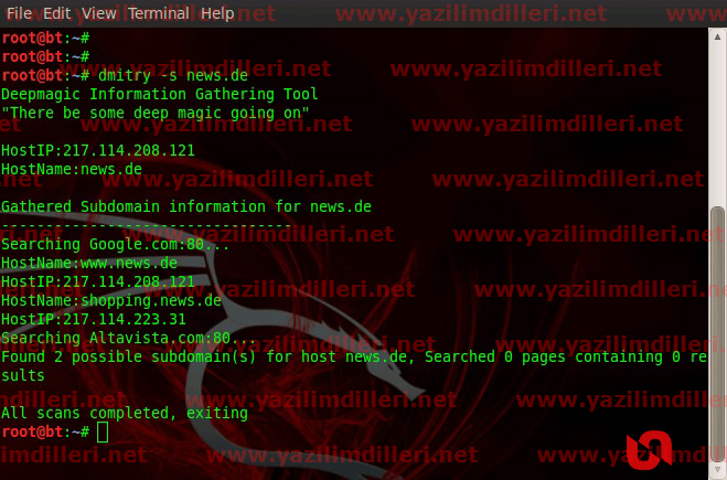 ./dmitry -s hedef:  Hedef sunucusuna ait subdomainleri arar.
