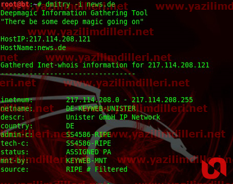 ./dmitry -i hedef: Hedef host üzerindeki ip adreslerini inceler ve whois bilgilerini toplar.