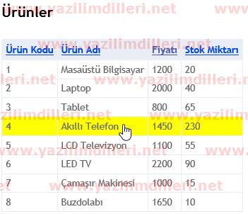 Projeyi çalıştırıp cursorı (fare imlecini) ürünlerin üzerinde gezdirdiğinizde ürünün arkaplan renginin sarı olduğunu ve tıkladığınızda /Home/Urun/{Id} (aşağıdaki örnek için /Home/Urun/4 ) sayfasının açıldığını göreceksiniz.