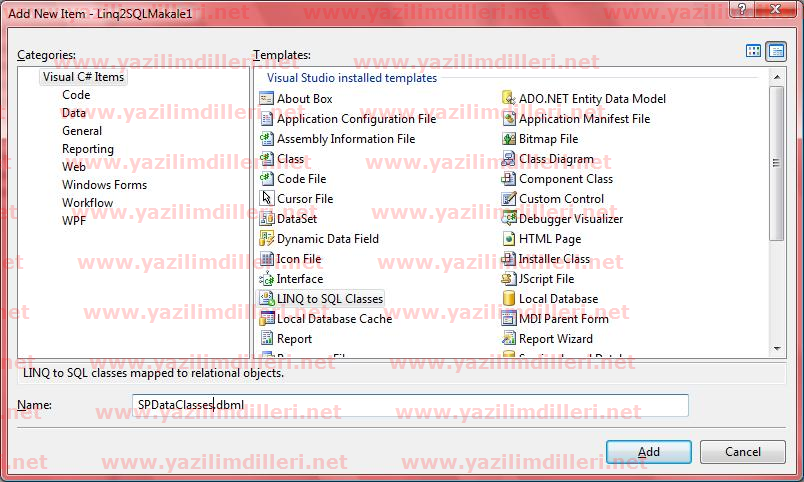 Öncelikle Project -> Add New Item ‘dan Linq to SQL Classes ekleyelim. Ismi de SPDataClasses.dbml olsun.