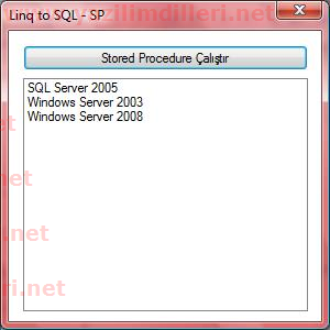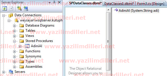 var kitaplar = dc.AdiniAl("server") : SPDataClassesDataContext'te bulunan AdiniAl isimli Stored Procedure’ü, dc.AdiniAl("") seklinde SPDataClassesDataContext’imizin bir methodu gibi kullanmaktayiz.