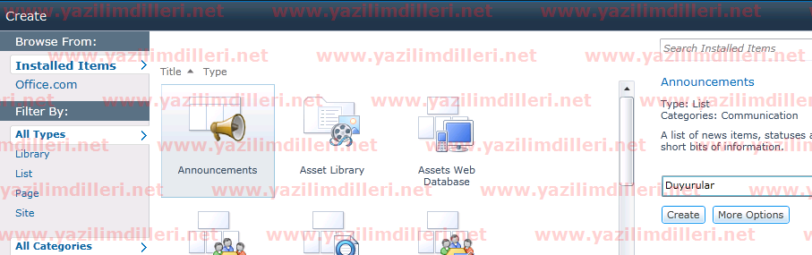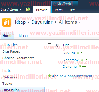 Şimdi Duyurular isminde bir Announcement oluşturalım ve içine kayıt ekleyelim.