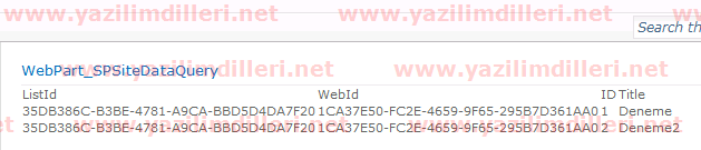 using System;  using System.Web.UI;  using System.Web.UI.WebControls;  using System.Web.UI.WebControls.WebParts;  using Microsoft.SharePoint;  using System.Data;     namespace SPFarmSolution.WebPart_SPSiteDataQuery  {      public partial class WebPart_SPSiteDataQueryUserControl : UserControl      {          protected void SatirEkle(Table tablo, System.Collections.Generic.List<object> parametreler)          {              TableRow satir = new TableRow();              foreach (object parametre in parametreler)              {                  TableCell hucre = new TableCell();                  Label label = new Label();                  if (parametre != null)                      label.Text = parametre.ToString();                  hucre.Controls.Add(label);                  satir.Cells.Add(hucre);              }              tablo.Rows.Add(satir);          }          protected void Page_Load(object sender, EventArgs e)          {              Table tablo = new Table();                 SPSiteDataQuery sorgu = new SPSiteDataQuery();              sorgu.Lists = "<Lists BaseType='0'/>";              sorgu.Query = "<Where>" +                  "<Contains>" +                  "<FieldRef Name='Title'/>" +                  "<Value Type='Text'>Deneme</Value>" +                  "</Contains>" +                  "</Where>";                 sorgu.Webs = "<Webs Scope='SiteCollection'/>";              sorgu.ViewFields = "<FieldRef Name='Title'/>";              sorgu.RowLimit = 2;                 SPWeb web = SPContext.Current.Web;              DataTable tablo2 = web.GetSiteData(sorgu);              if (tablo2.Rows.Count > 0)              {                  SatirEkle(tablo, new System.Collections.Generic.List<object>                      {                          tablo2.Columns[0].ColumnName,                          tablo2.Columns[1].ColumnName,                          tablo2.Columns[2].ColumnName,                          tablo2.Columns[3].ColumnName                      });              }              foreach (DataRow satir in tablo2.Rows)              {                  SatirEkle(tablo, new System.Collections.Generic.List<object>                  {                      satir[0].ToString(),                      satir[1].ToString(),                      satir[2].ToString(),                      satir[3].ToString()                  });              }              this.Controls.Add(tablo);          }      }  }