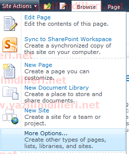 Sharepoint sitemizde Site Actions -> More Options’a gelelim.